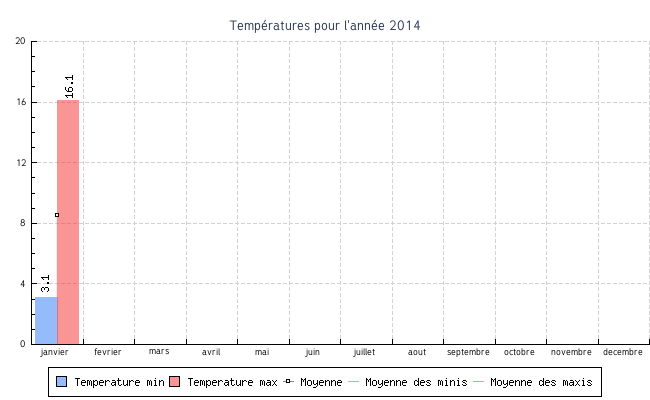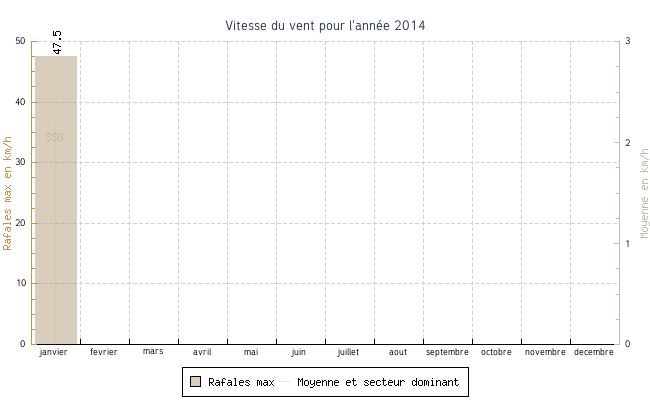 | janvier | 3.1 °C | 5.8 °C | 16.1 °C | 12.1 °C | 8.5 °C | 2.2 km/h | 47.5 km/h | SSO |
